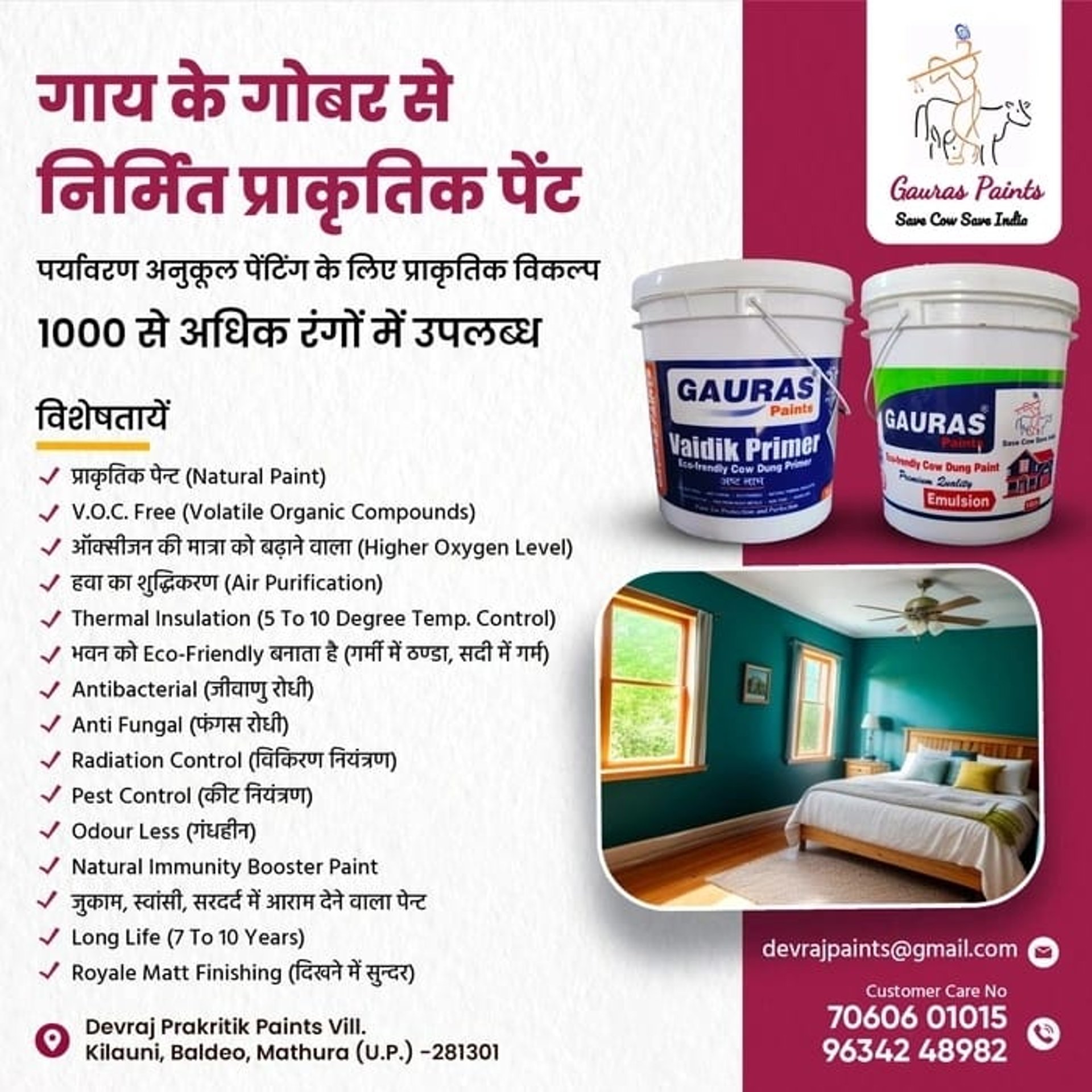 Discover the benefits of Gauras Paints' eco-friendly cow dung-based paints. Our products, including emulsion, distemper, primer, and putty, are antibacterial, antifungal, odourless, and VOC-free, ensuring a safe environment for your health and nature. Choose sustainable, low-cost solutions for your painting needs today!